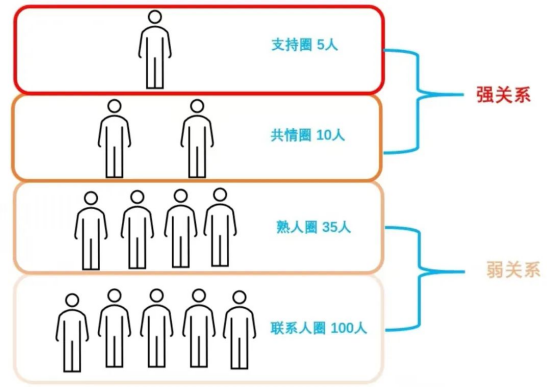 第二圈:共情圈。好友。这是你主要的社交圈。遇到重大事情时,部分人是可以依靠的。但他们主要是给你意见,以及为你加油打气,同你分享喜怒哀乐,从精神层面给你支持。