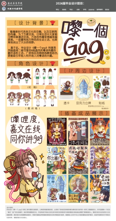 设计阐述:毕业设计《嚟一个 gag》利用二维可爱的Q版画风,以粤语有趣的歌后语、土话和广府地区的网络热梗为素材进行创作的一系列二维插画设计。本作品围绕一个名为“嘉文”的广府女孩展开,她非常热爱粤语文化,并且热衷于将自己在生活中的所见所闻和学习到的哩语分享给身边想要了解粤语的人。粤语方言文化历史悠久文化底蕴深厚,是区域文化的重要组成部分,用现代插画这种新颖的表现形式来对粤语进行宣传,能提高人们对于本土方言的重视及保护意识,促进年轻群体对于传统文化的传承,增强民族文化自信心。