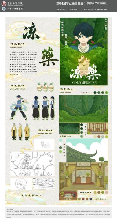 设计阐述:毕业设计《凉药》采用逐帧动画制作。以广东岭南中药为主题,目的在于宣传南药的历史文化,提高大众对岭南中药的认识和保护意识,促进大众对传统文化的认同感。通过将岭南中药文化与二维动画表现形式相结合,利用短视频平台在互联网的传播速度,让大众认识并坚定传承文化具有重要意义。