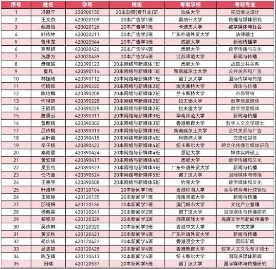 四年考研梦,一朝捷报传!随着2024年全国硕士研究生复试结果陆续公布,以及境外高校录取结果逐步揭晓,传院学子考研录取喜报频传,截止目前,共有35名同学分别被华南师范大学、广东外语外贸大学、香港浸会大学、悉尼大学、诺丁汉大学等境内外知名高校录取。